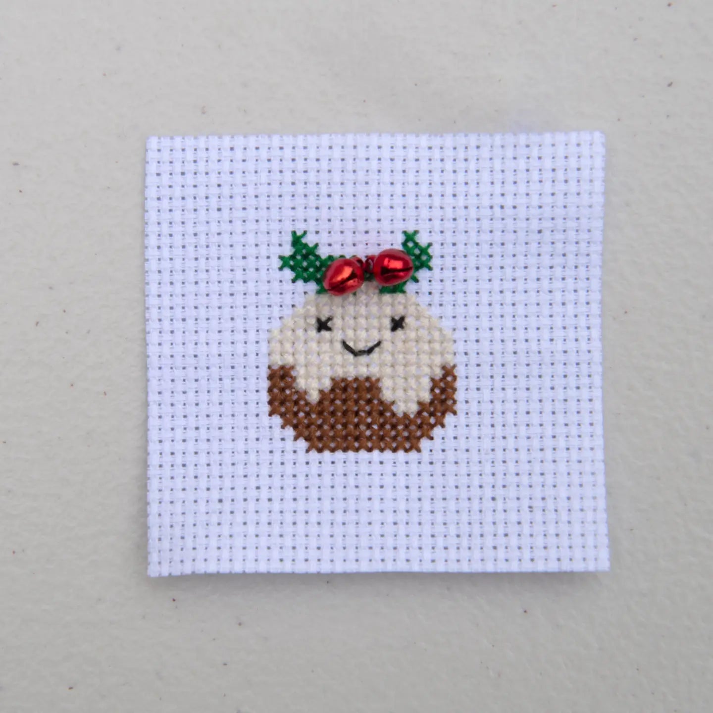 Mini Cross Stitch Kit in a matchbox! Everything you need to make a funky Kawaii Christmas Pudding design neatly packaged into a matchbox.