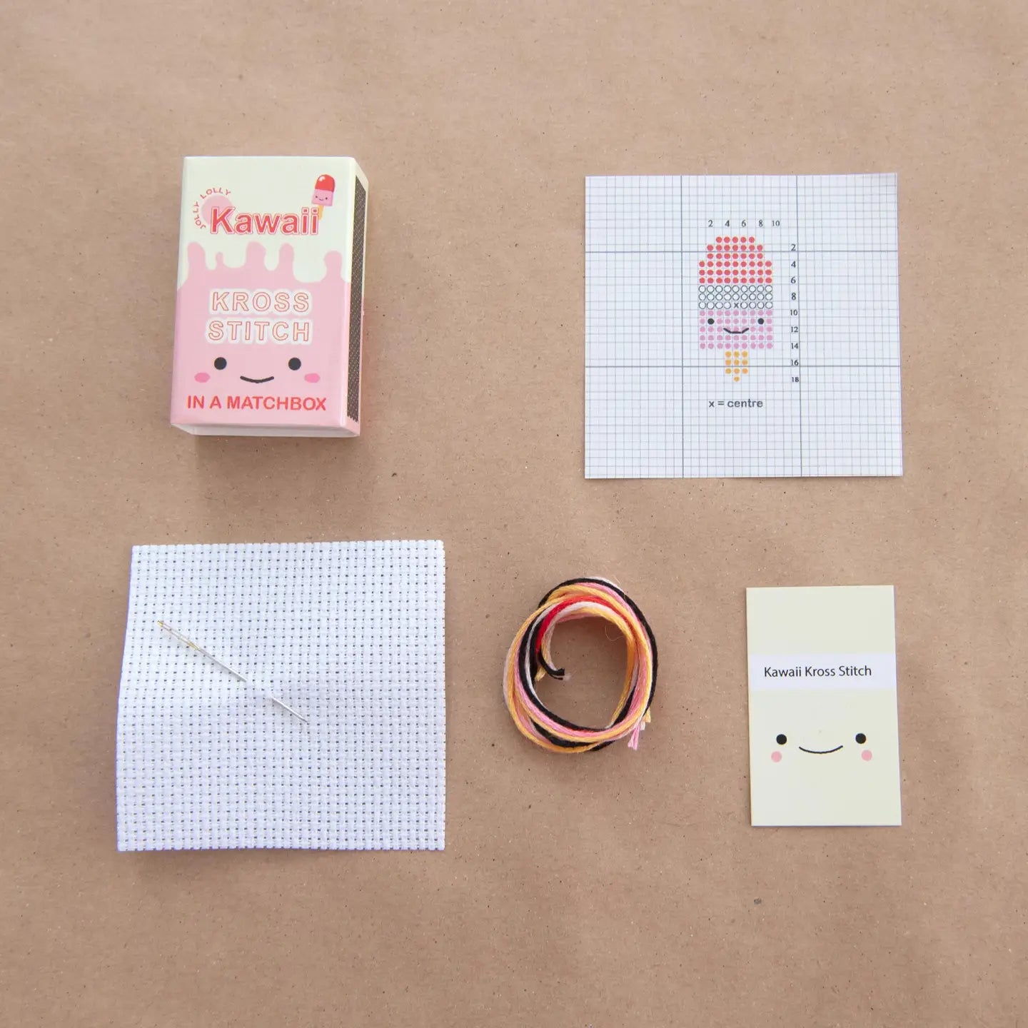Mini Cross Stitch Kit in a matchbox! Everything you need to make a funky Kawaii Ice lolly design neatly packaged into a matchbox.
