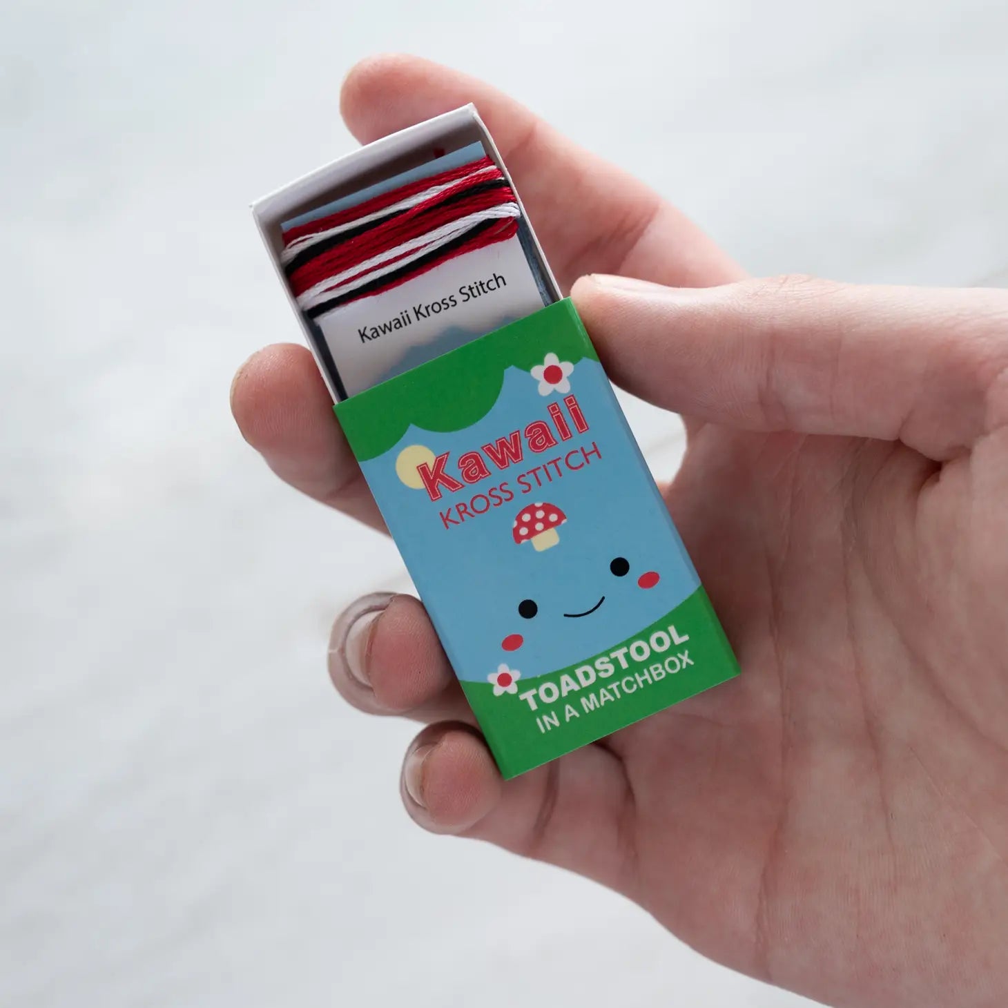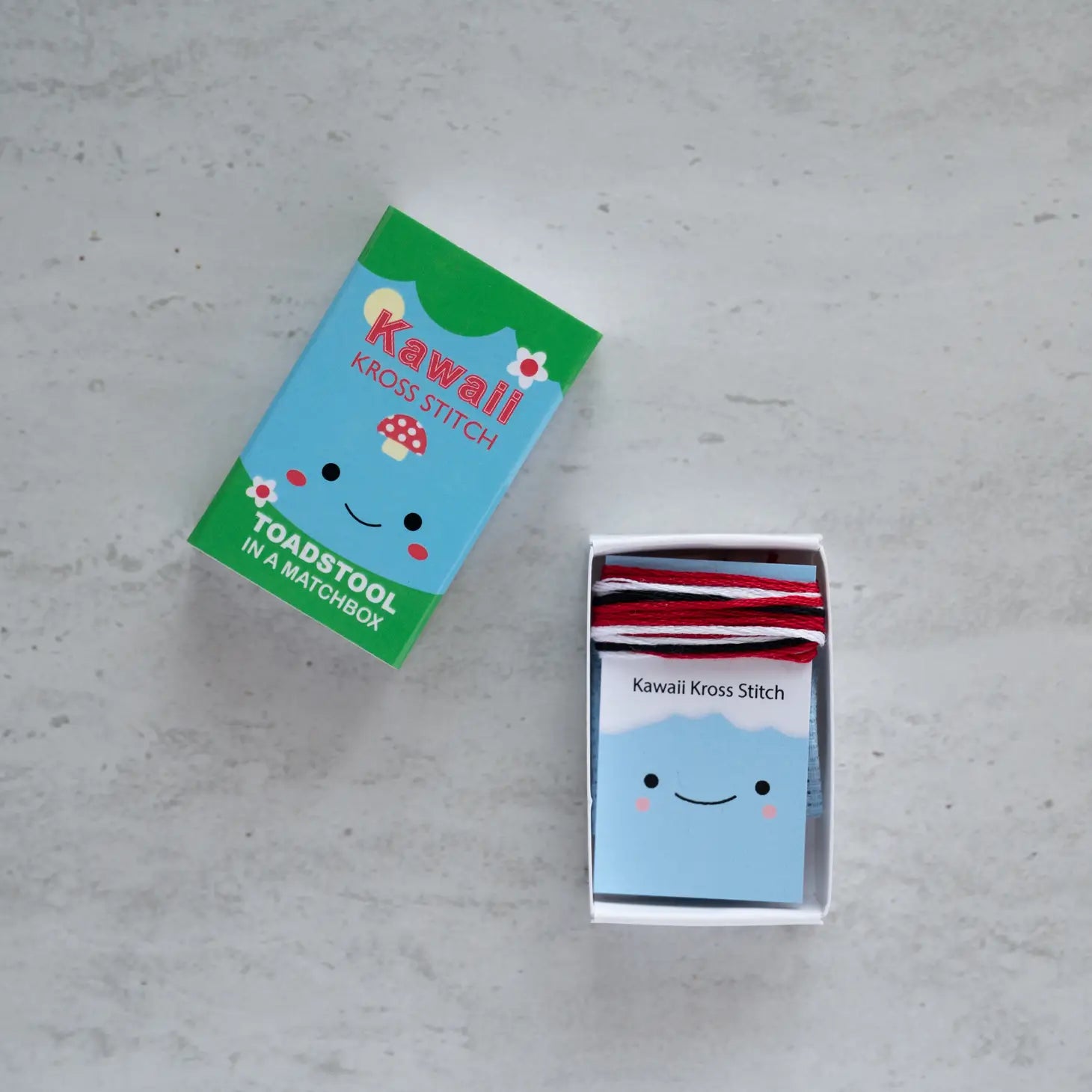 Mini Cross Stitch Kit in a matchbox! Everything you need to make a funky Kawaii Toadstool design neatly packaged into a matchbox.