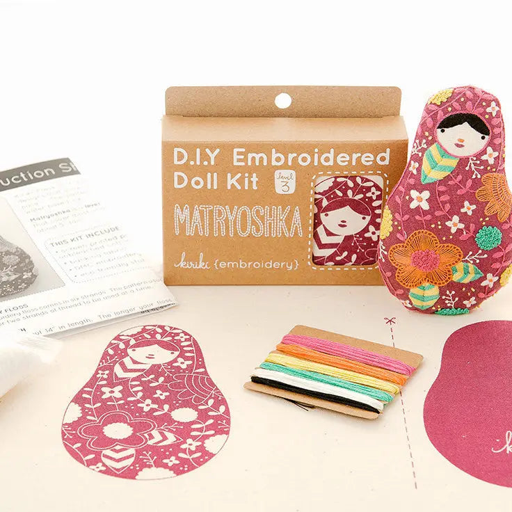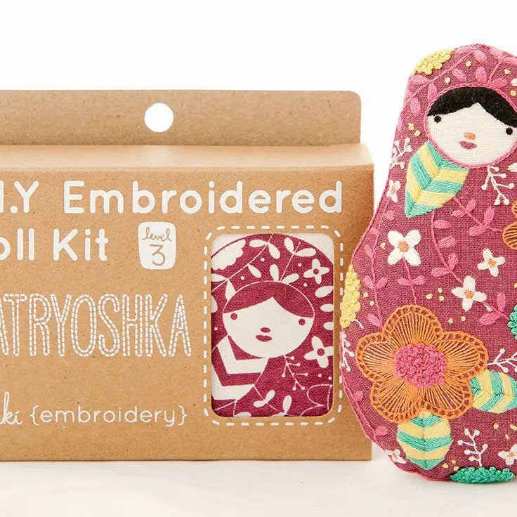 This Matryoshka is an intermediate pattern, using basic and intermediate stitches. The kit involves embroidering the detail and then sewing into a doll.