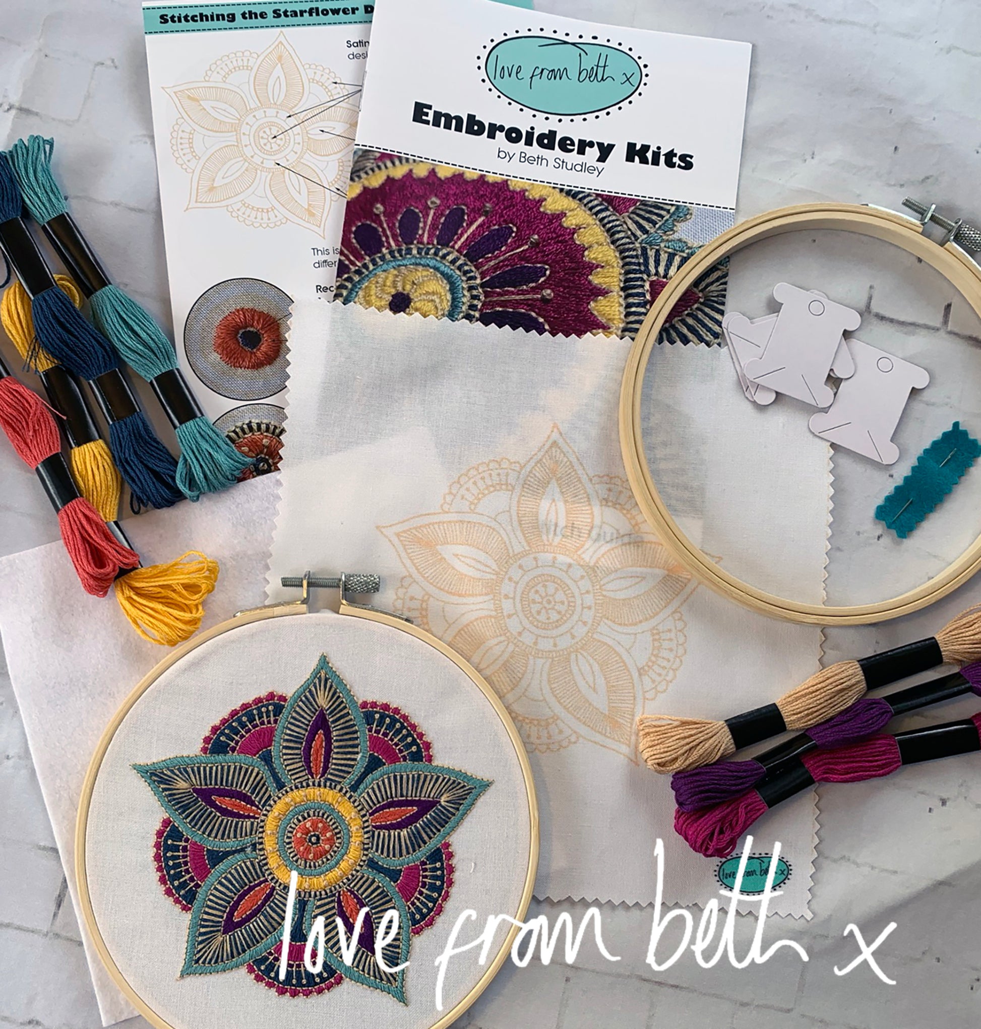 The designs are taken from the original hand drawn artwork used to create my 'Henna' fabric collections. This Starflower kit and the colours used are taken from the main print in my new henna collection launching in Sept 21.